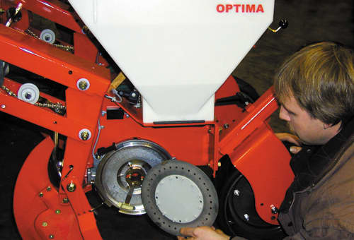 - O přesné hloubkové vedení se strarají dvě otevřená (paprsková) kola o šířce 120 mm a průměru 410 mm. Kola jsou umístěna přesně na úrovni bodu výpadu, takže je zajištěno hloubkové vedení přesně v místě, kam dopadá osivo.