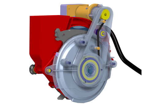 - Žádné tření, žádné opotřebení, nízký hnací moment, minimální údržba: Výsevní kotouč rotuje v secím srdci spolu s vakuovou komorou. Tento secí buben je přes dutý hřídel připojený k ventilátoru vytvářejícímu vakuum.