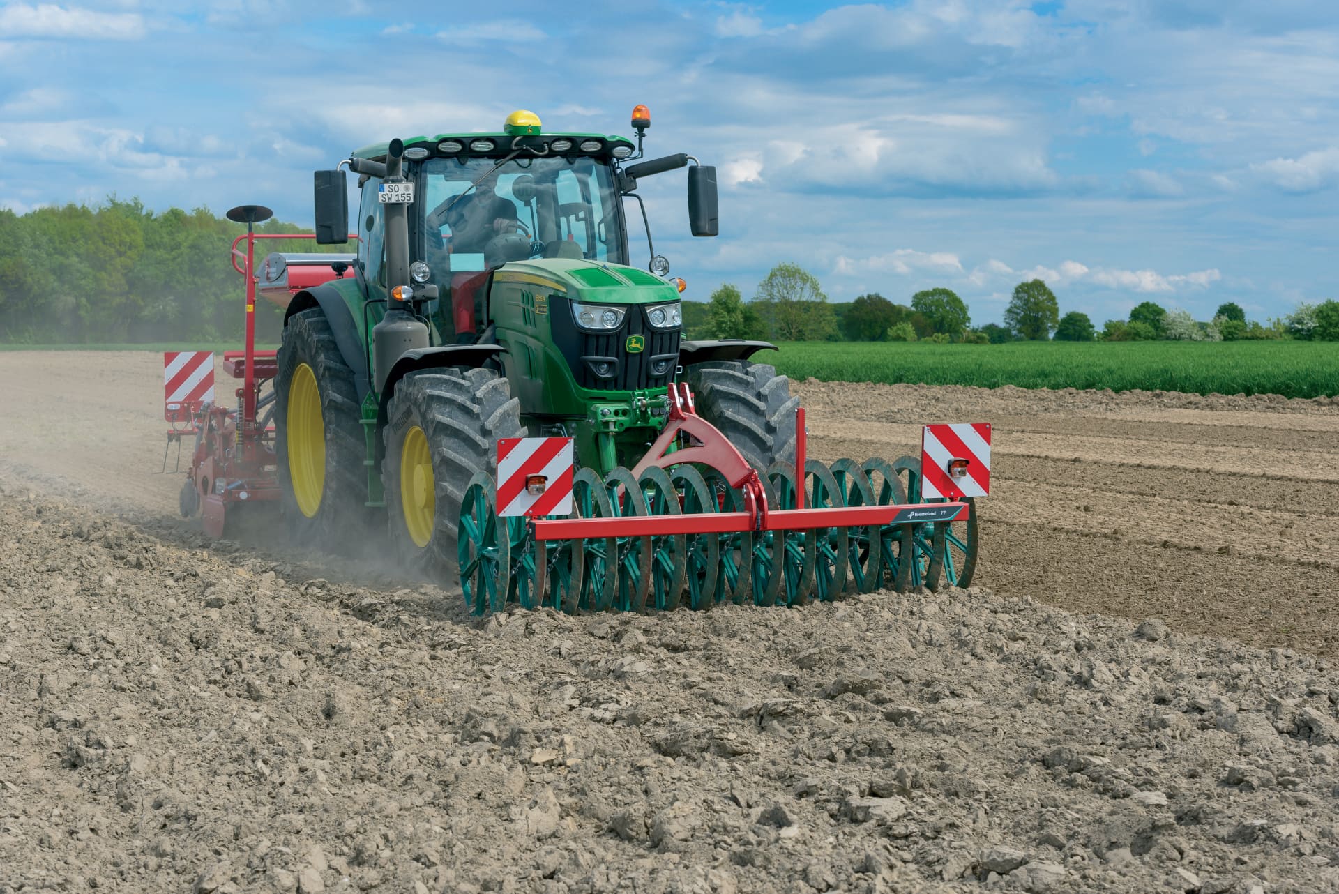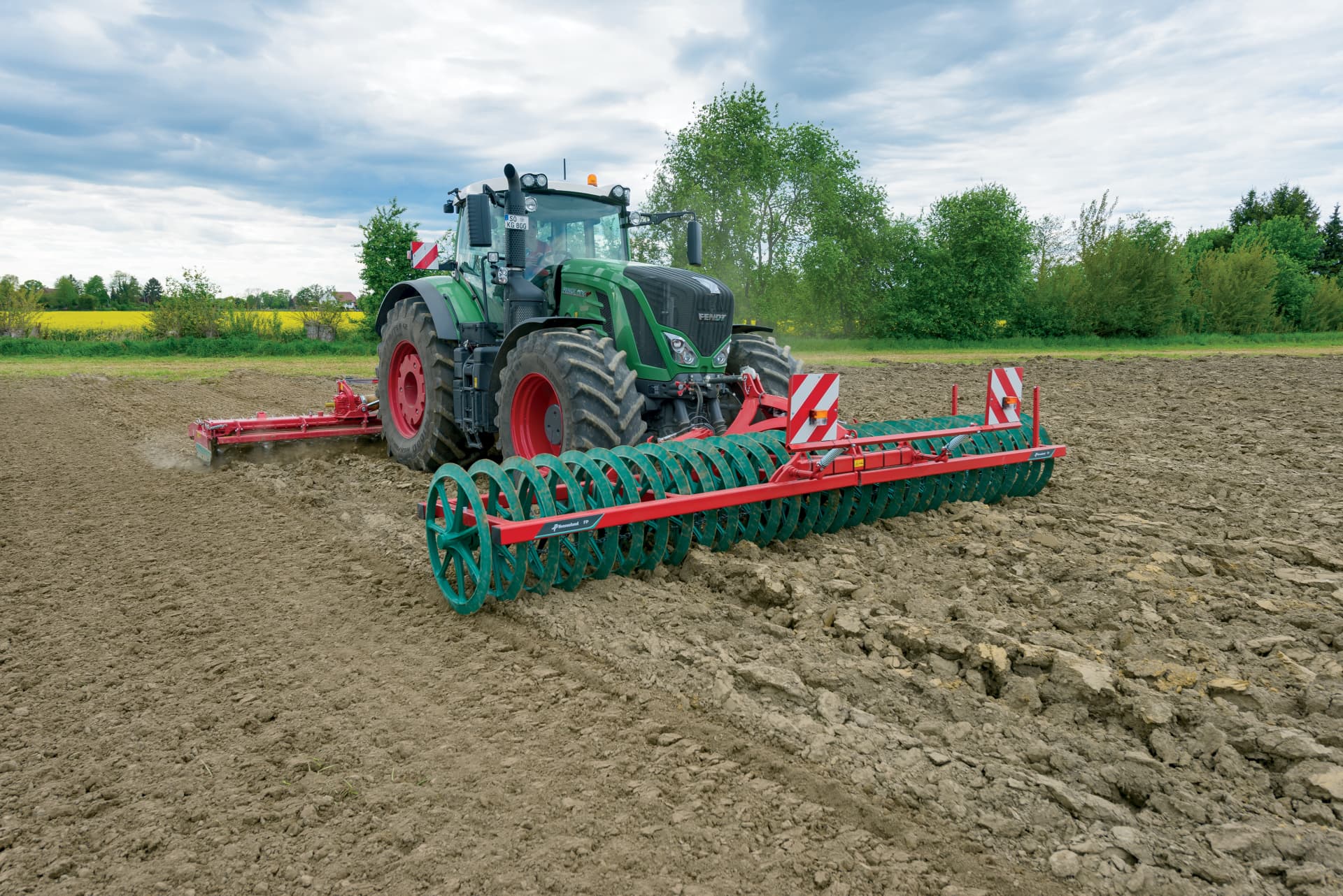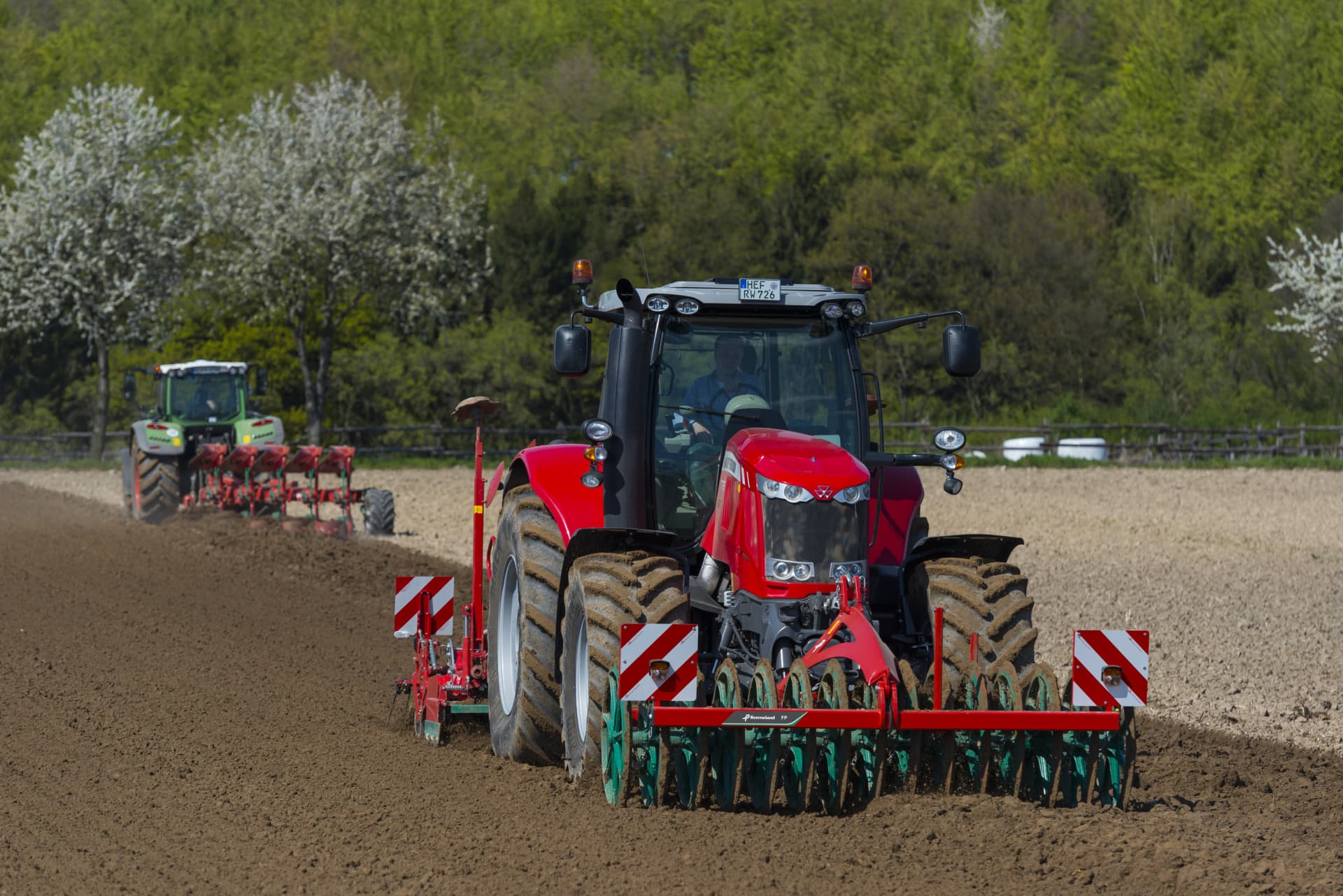 pohodlné: pouze 1 traktor pro 2 nářadí v práci i při přepravě. Například čelně nesený půdní pěch a rotační brány agregované vzadu