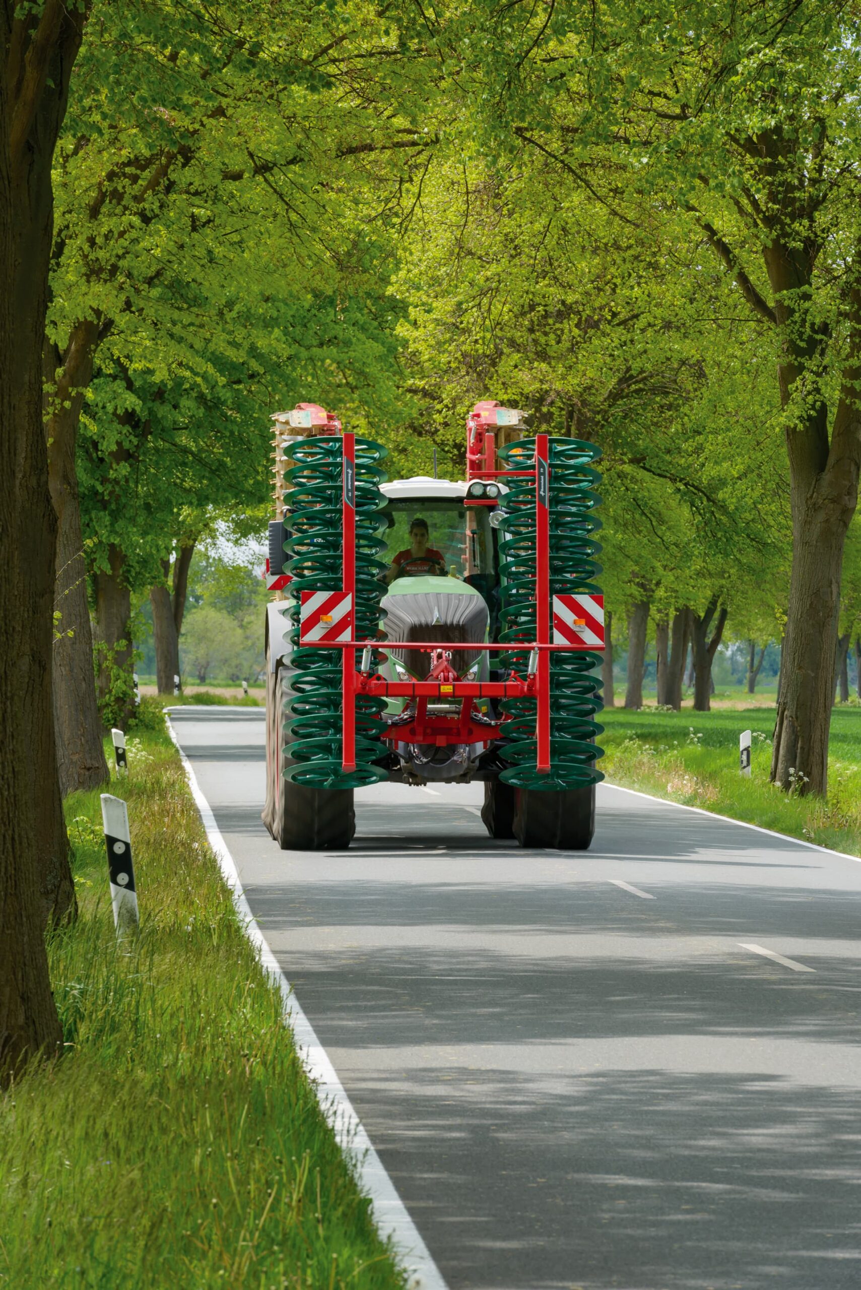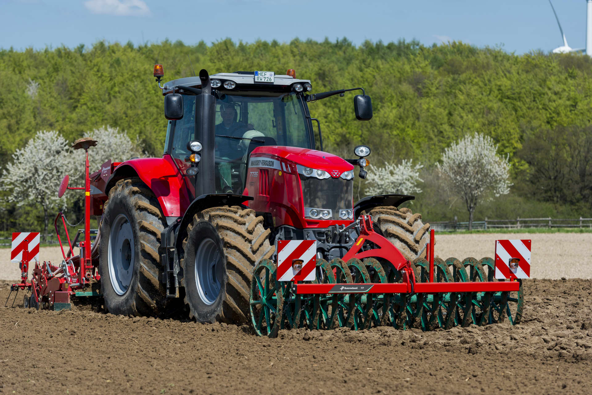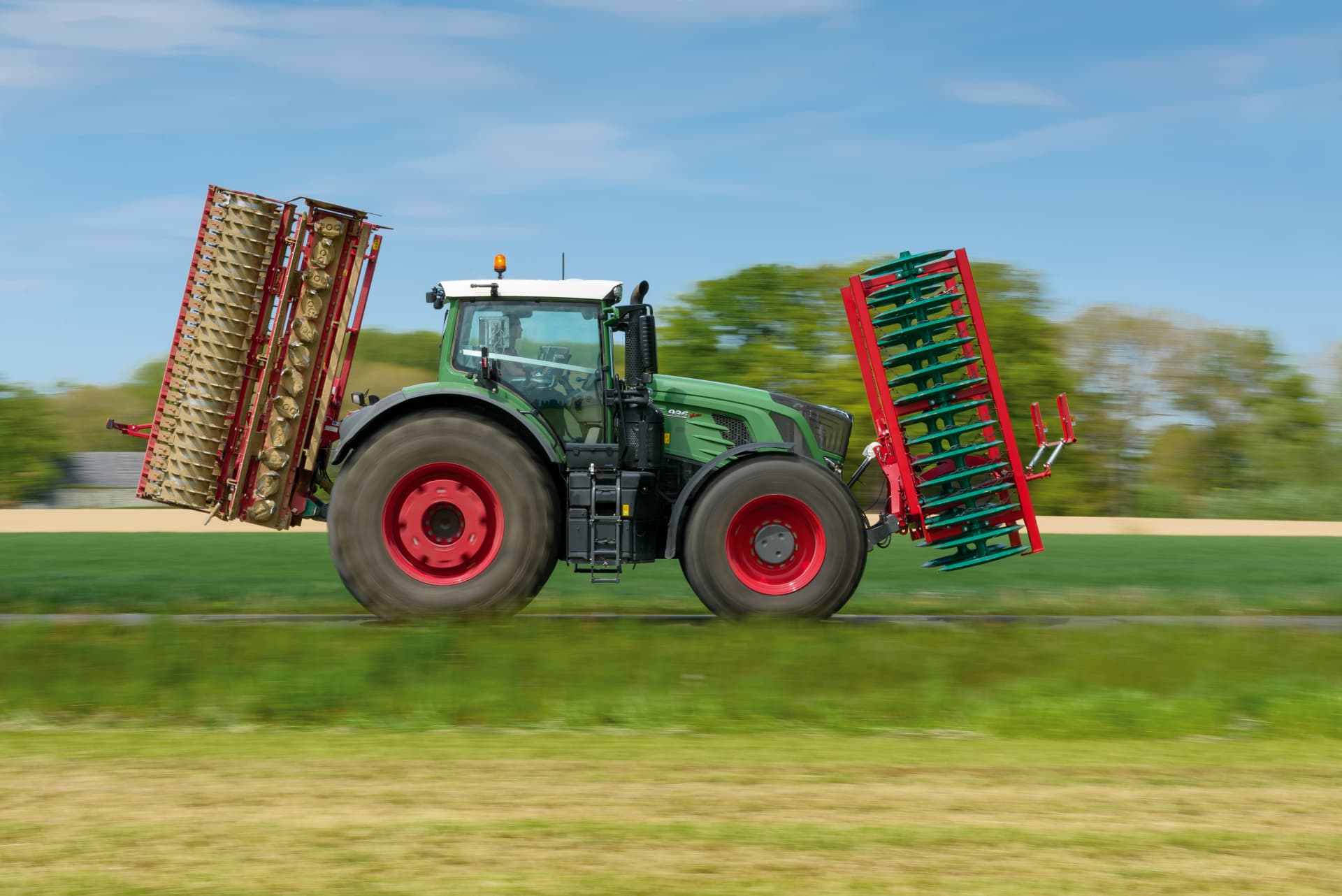 pohodlné: pouze 1 traktor pro 2 nářadí v práci i při přepravě. Například čelně nesený půdní pěch a rotační brány agregované vzadu