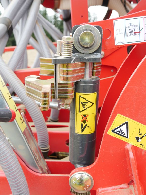 Paralelogram a zavěšení secí lišty stroje e-drill přímo na nosníku pěchovacího válce zajišťují optimální nastavení hloubky práce rotačních bran a secích botek pro přesné ukládání osiva. Důležité: nastavení rotačních bran nemá žádný vliv na postavení secí botky ani na hloubku setí.