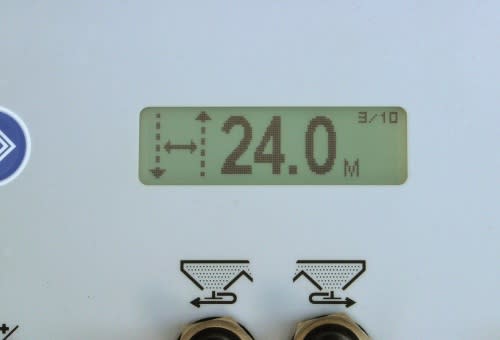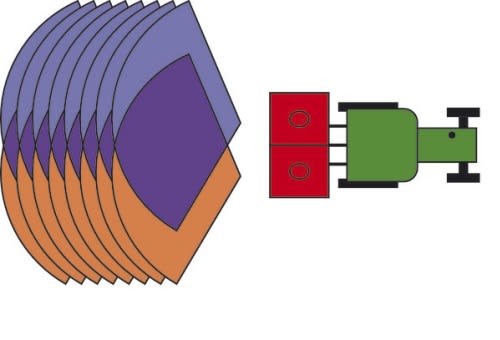 - Stálý obrazec rozmetání: Osm lopatek na kotouč, osm sektorů na otáčku zajišťuje rovnoměrné rozdělování. Obrazec rozmetání s dvojím překrytím.